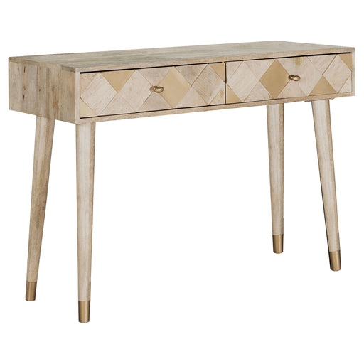 Enhance your space with the natural charm of this two-door accent cabinet, crafted from solid mango wood in a warm natural finish. The checkered woodgrain pattern across the cabinet doors creates a striking visual effect, blending rustic and modern aesthetics. Gold-finished metal tips on the tapered legs add a subtle touch of elegance, while the boxy silhouette ensures a clean, contemporary look. Offering ample storage behind two doors, this cabinet is a versatile piece perfect for entryways, living rooms, or compact spaces.